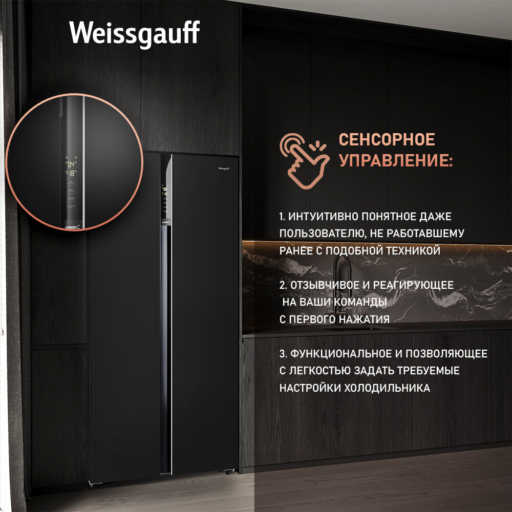 Отдельностоящий холодильник с инвертором Weissgauff Wsbs 600 BG NoFrost Inverter Side by Side двухдверный, 3 года гарантии, Мощность замораживания 12 кг сутки, Объём 660 л, Сенсорное управление, Суперзаморозка, Суперохлаждение