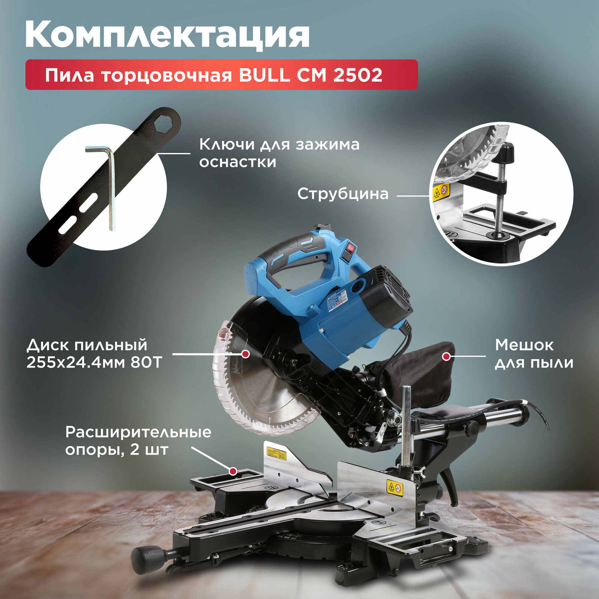 Торцовочная пила BULL CM 2502 в кор. 1800 Вт, 255 мм, глуб. до 89 мм, шир. до 310 мм, лазер, протяжк (Наклонный двигатель, диск 80T в комплекте) (0325