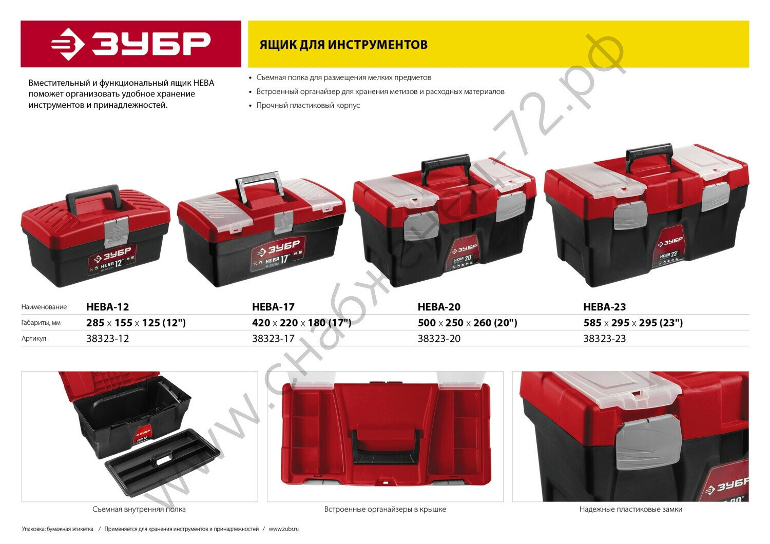 Ниже Вы можете прочитать отзывы на Пластиковый ящик для инструментов ЗУБР НЕВА-17 420 х 220 х 180 мм (17) 38323-17, ознакомится с подробными характеристиками, посмотреть интересные обзоры и фотографии на Пластиковый ящик для инструментов ЗУБР НЕВА-17 420 х 220 х 180 мм (17) 38323-17.