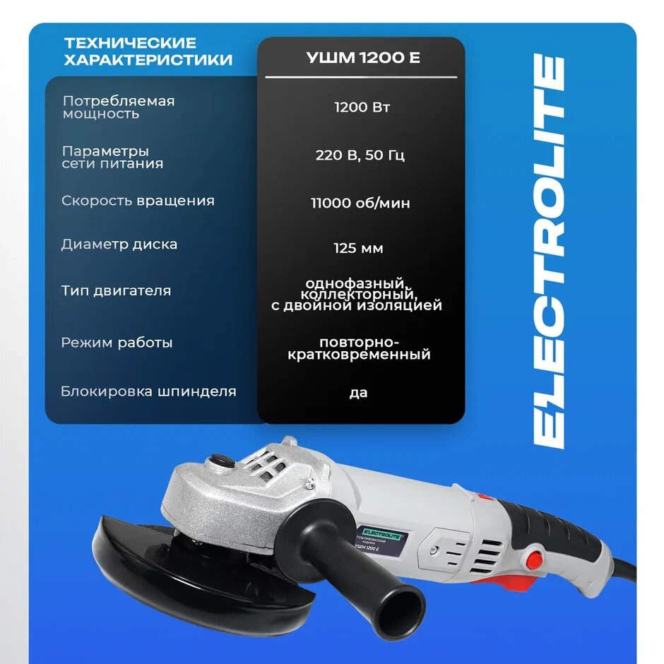 Шлифовальная машина / УШМ / Болгарка отрезная по металлу ELECTROLITE УШМ 125/1200Е ( 1200 Вт, 125 мм, регулировка оборотов, сетевая) шлифмашина угловая