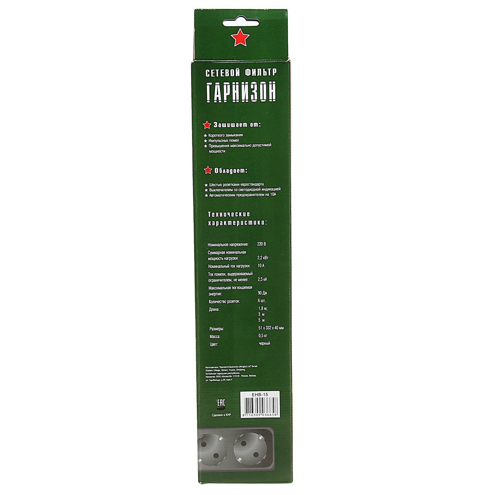 Сетевой фильтр "Гарнизон", 6 розеток, 5 м, 10 А, 2200 Вт, черный