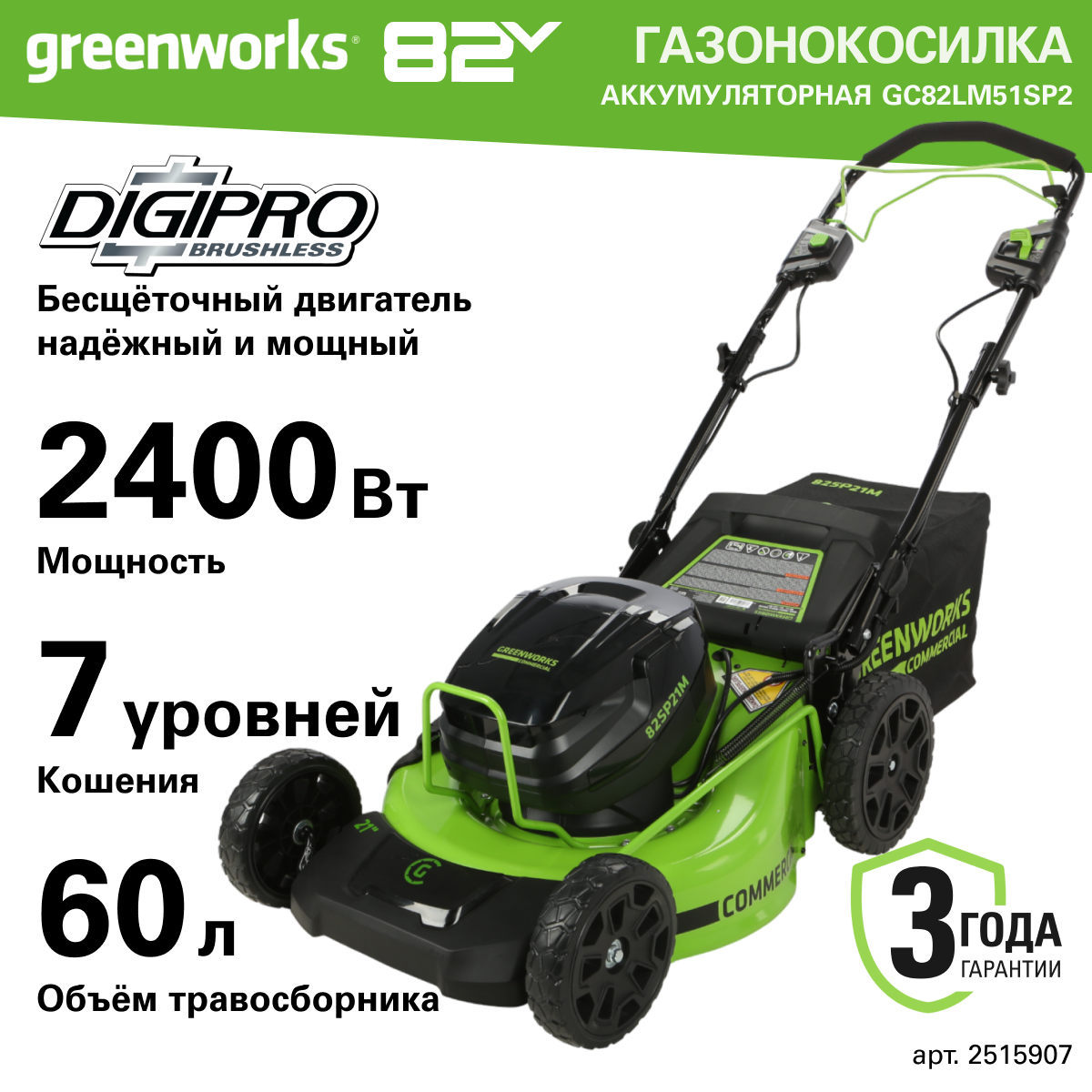Газонокосилка самоходная аккумуляторная 51 см Greenworks 82V GC82LM51SP2 2515907, бесщёточная, без А