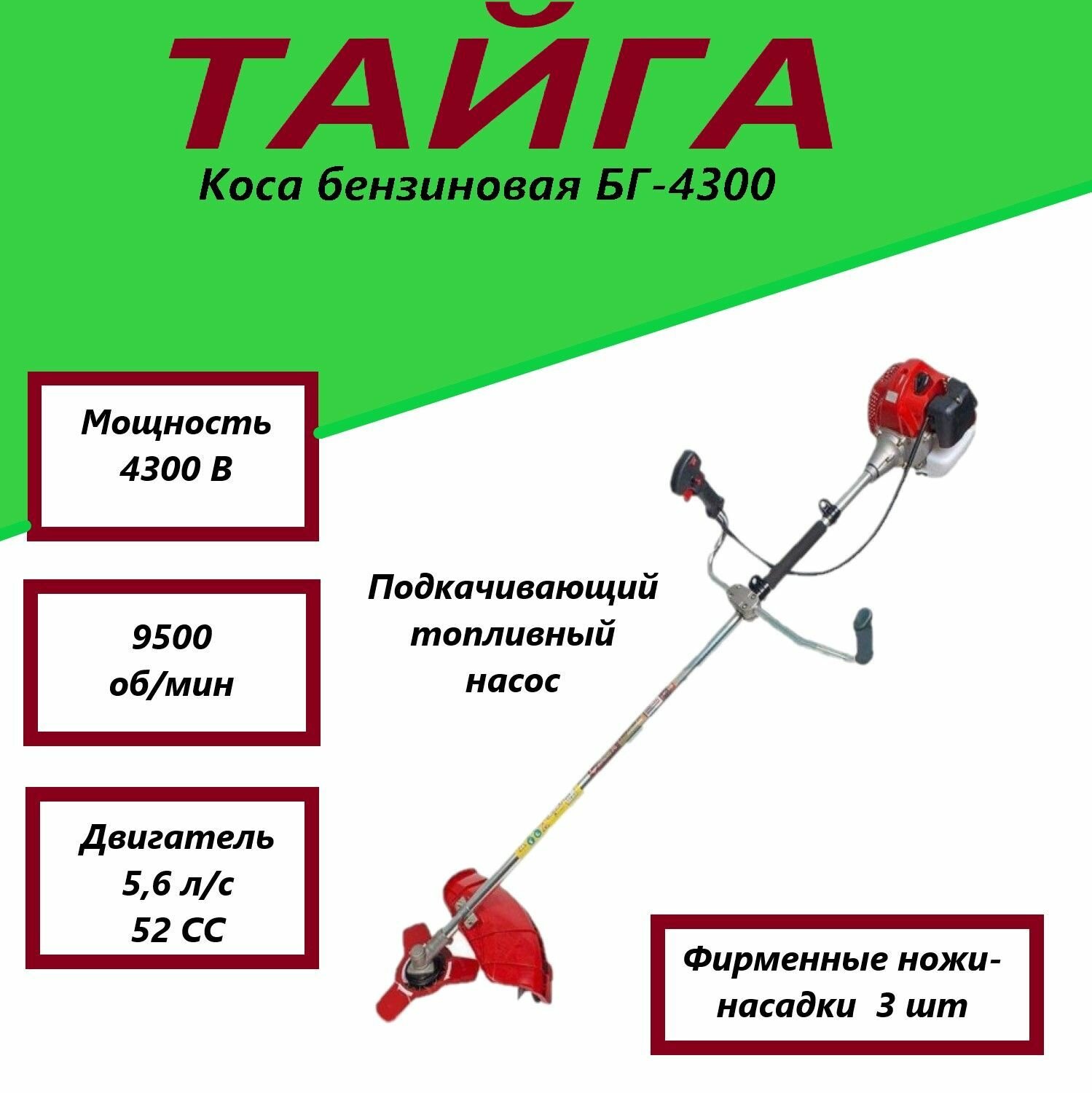 Коса бензиновая Тайга БГ4300 (2х тактный двигатель), 52 СС, 4300Вт, 9500об/мин, 415мм Триммер, Газонокосилка