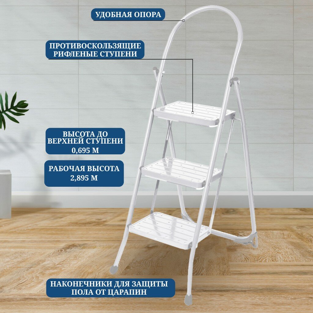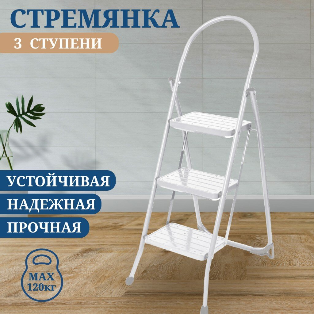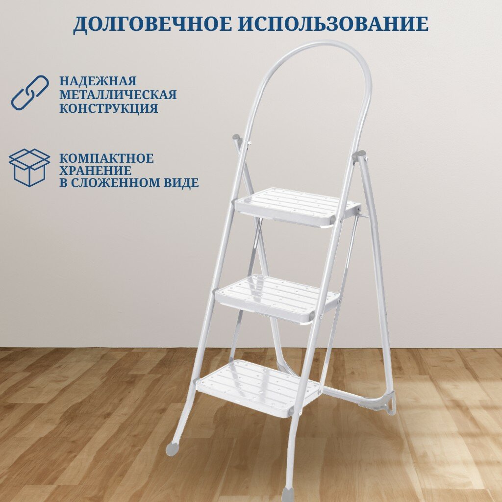 Металлическая стремянка-лестница Nika с широкими ступенями для дома, дачи, огорода, 3 ступени, белый цвет