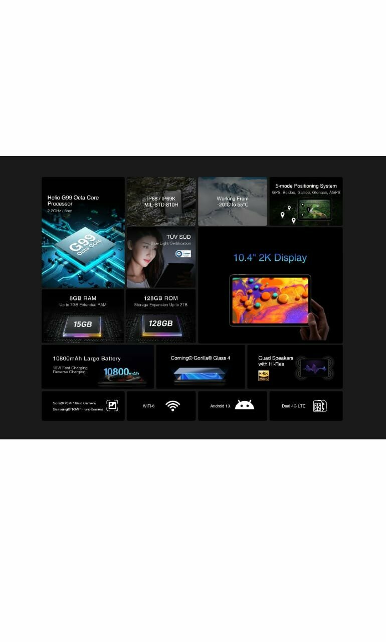 планшет doogee r10 10.3'' 1200 x 2000 пикселей ips/mediatek helio g99 -- octa/8gb/128gb/3g/gps/wifi/5.2/16 мп+20/microsd/10800mah/820g/android 13/1y/moonlight silver