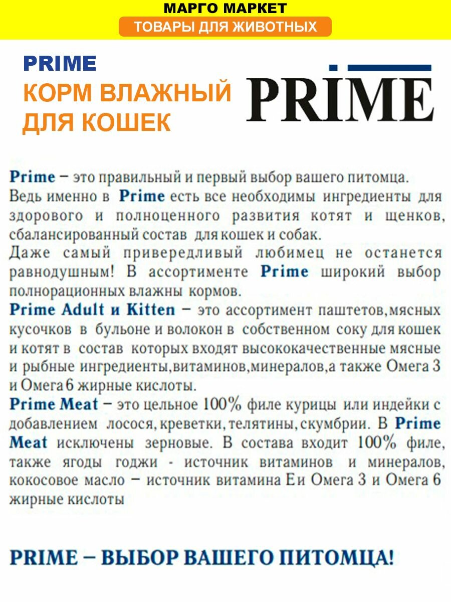 Ниже Вы можете прочитать отзывы на PRIME 75г Курица кусочки в соусе для кошек х 24шт., ознакомится с подробными характеристиками, посмотреть интересные обзоры и фотографии на PRIME 75г Курица кусочки в соусе для кошек х 24шт..