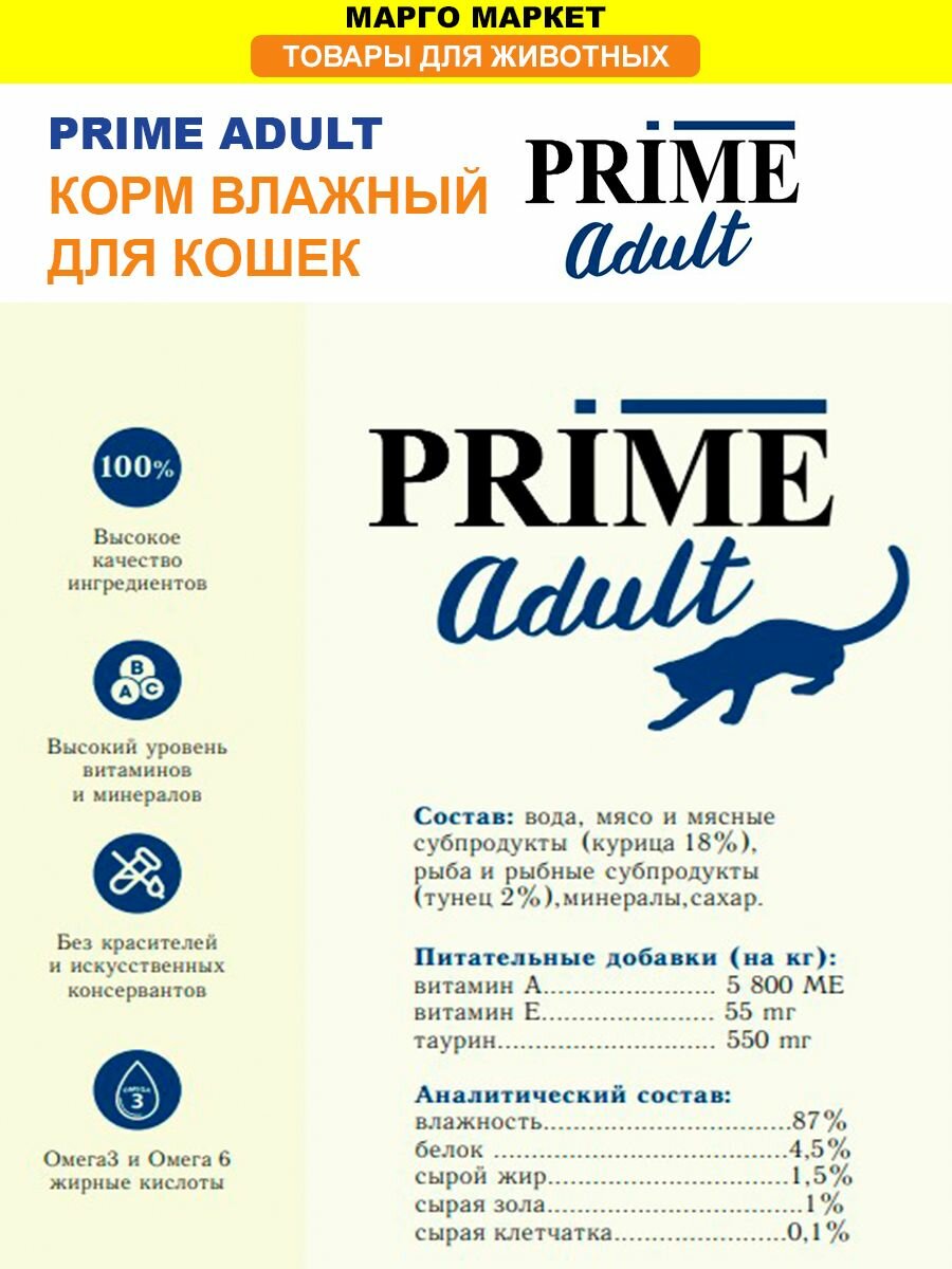 PRIME ADULT CAT для взрослых кошек с тунцом и кальмаром в собственном соку (70 гр х 24 шт)