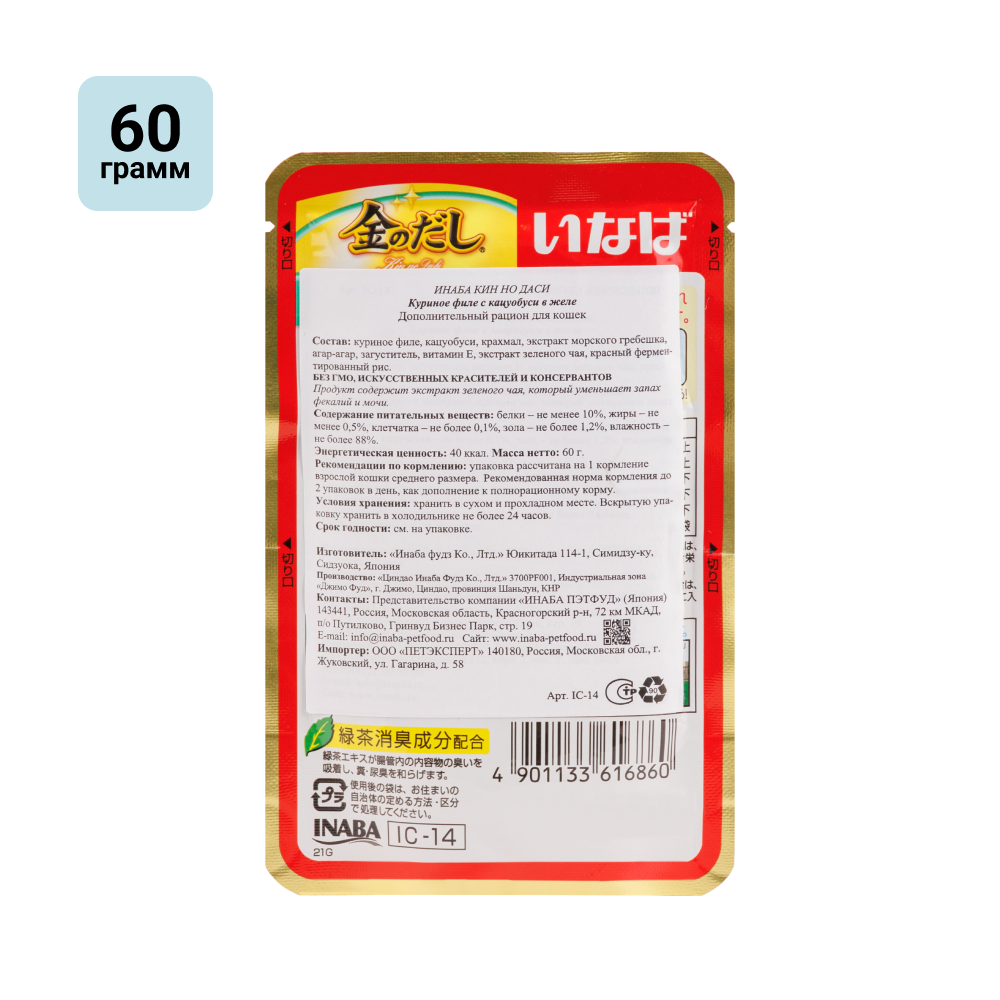 INABA киннодаси пауч для кошек Куриное филе+кацуобуси в желе 12х60г