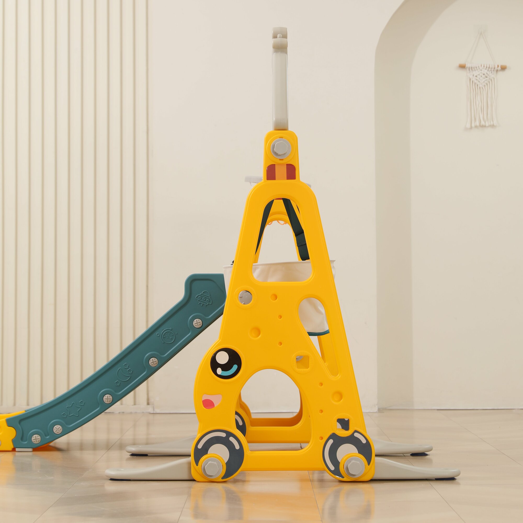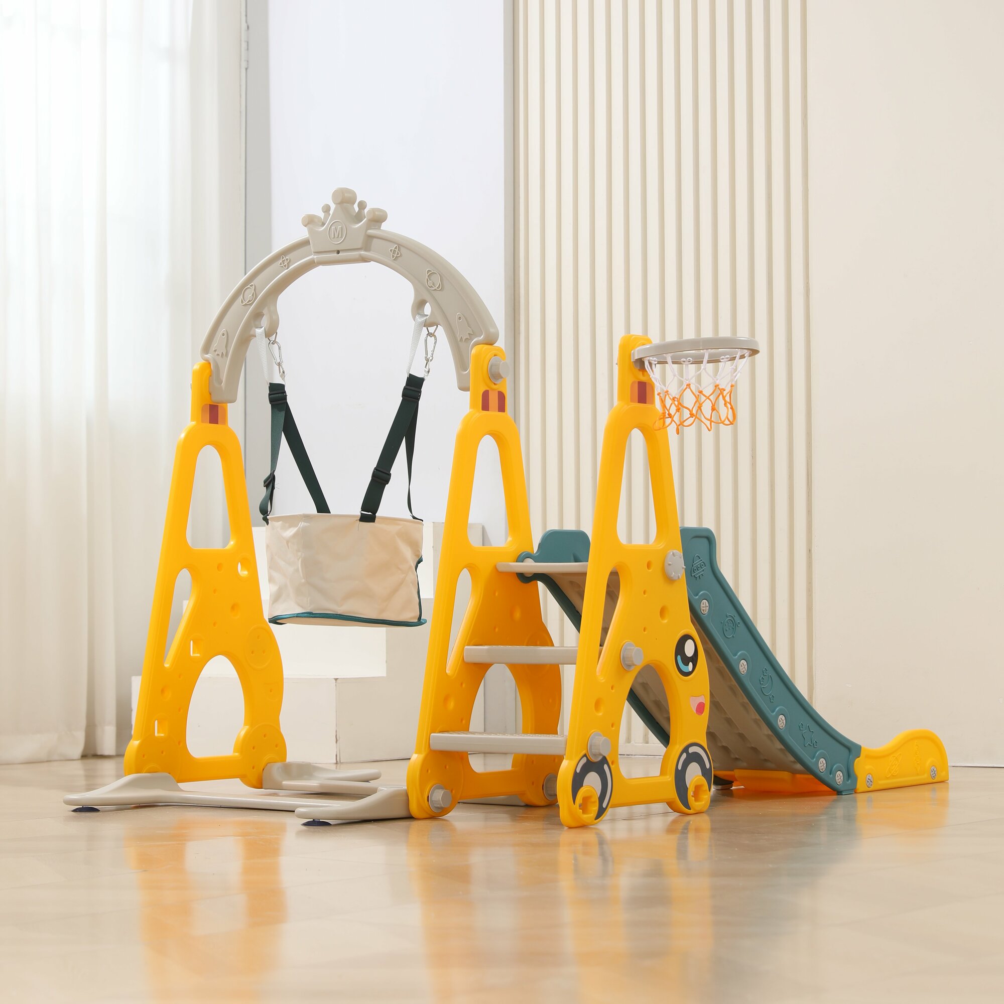 Купить Горка детская UNIX Kids Funny Car Yellow с качелями, со спуском 138 см, из пластика, с баскетбольным кольцом, желтый