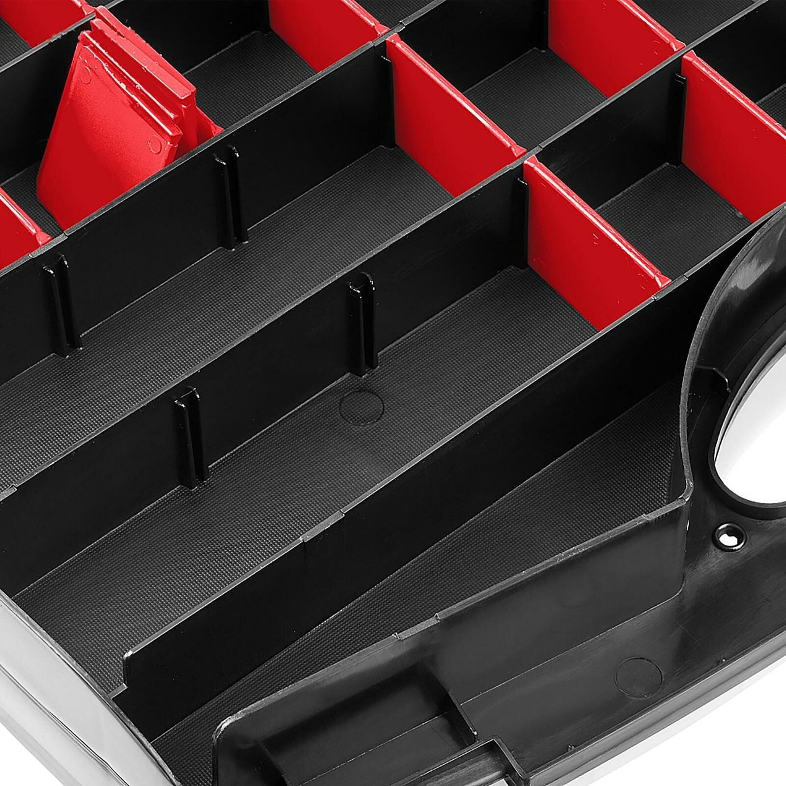| Плюсы: | Давно мечтал о таком чемоданчике, на фото заявлено множество раздельных секций. Если бы с органайзером доставили красные перегородки, которые должны быть в комплекте как на фото, то было бы очень много секций и было бы удобно хранить различные мелкие вещи, метизы и т.д, не смешивая их. Ради этого и покупался органайзер |