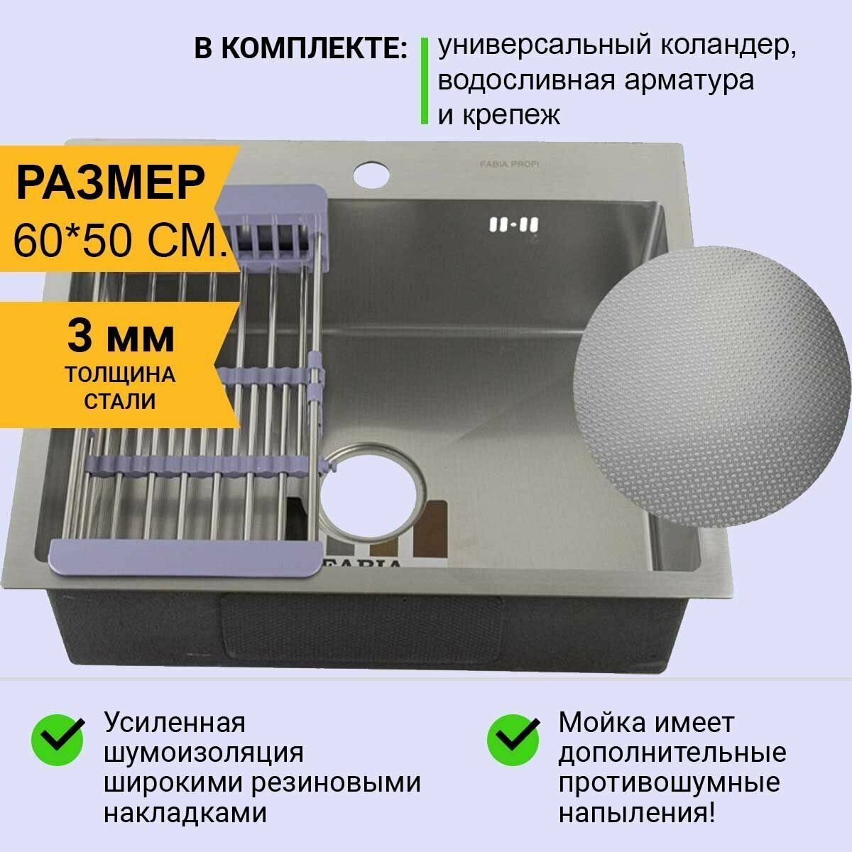 Мойка нержавеющая врезная 60х50 сатин FABIA Profi (3.0х200) выпуск 3 1/2 с сифоном, с коландером