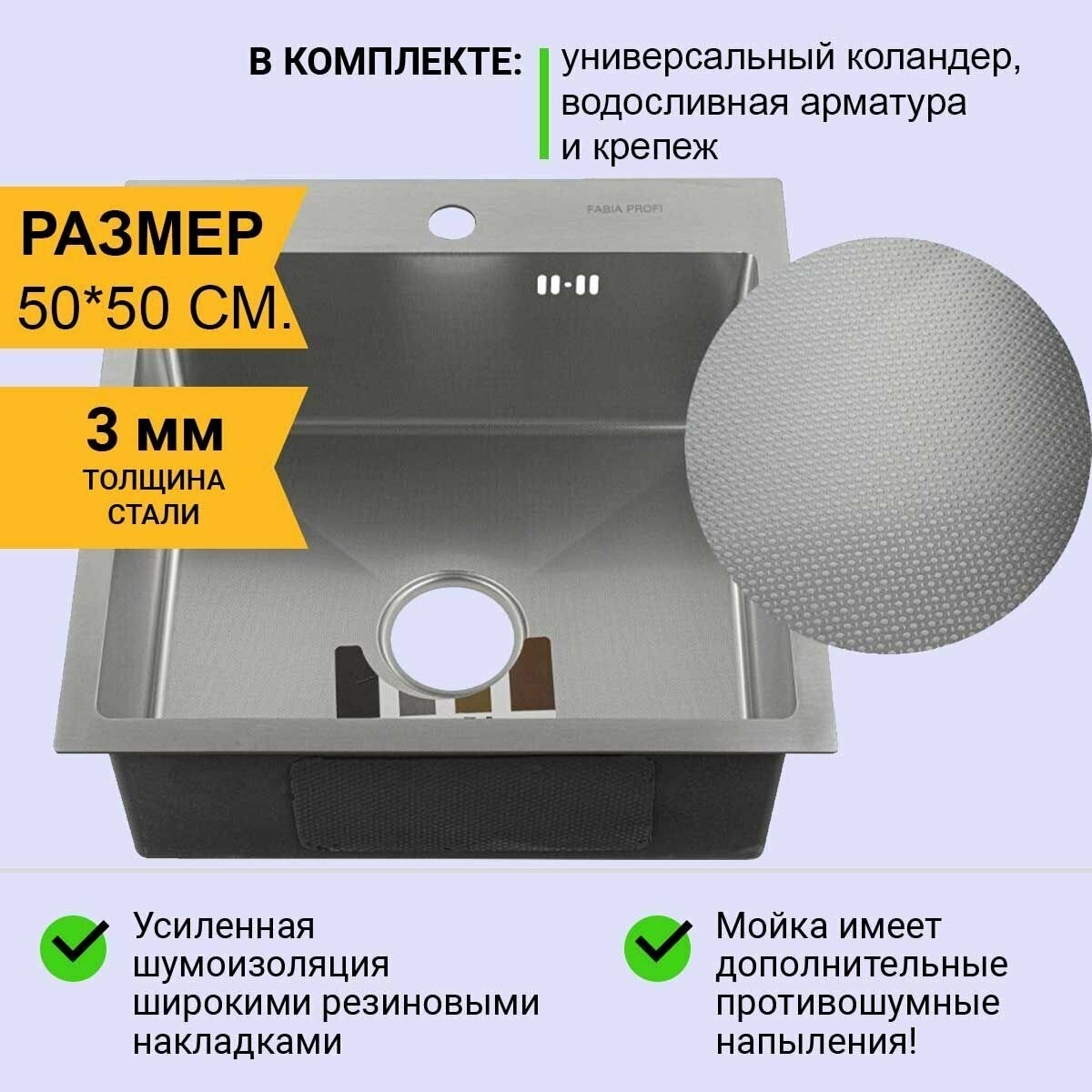 Мойка из нержавеющей стали FABIA Profi врезная.50х50 см. Толщина 3 мм. Глубина 20 см. Сифон, корзина, коврик в комплекте.