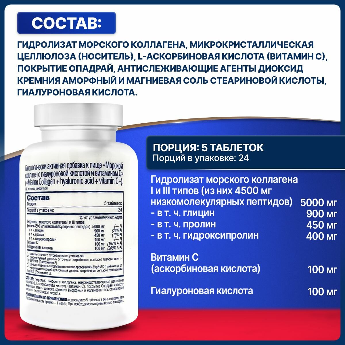 | Дополнительная информация | рекомендации по применению: принимайте 1 порцию (5 таблеток) в день; состав: на одну порцию, размер порции 5 таблеток; пептиды гидролизованного рыбного коллагена I типа 5000 мг, витамин С (аскорбиновая кислота) 100 мг, гиалуроновая кислота 100 мг, другие ингредиенты; микрокристаллическая целлюлоза (носитель), аэросил (агент антислеживающий), стеарат магния (агент антислеживающий), покрытие опадрай |
