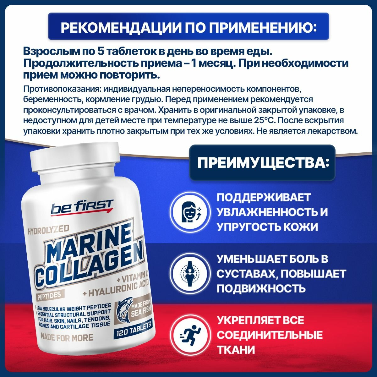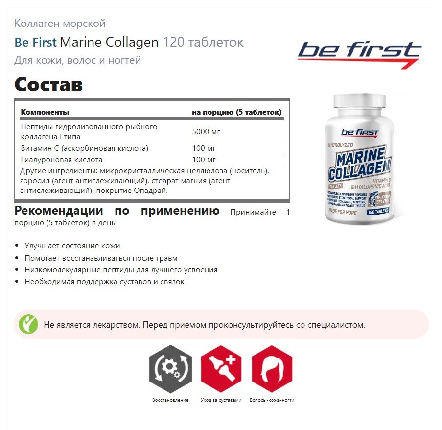 Ниже Вы можете прочитать отзывы на Be First Marine Collagen + hyaluronic acid + vitamin C 120 таблеток (Be First), ознакомится с подробными характеристиками, посмотреть интересные обзоры и фотографии на Be First Marine Collagen + hyaluronic acid + vitamin C 120 таблеток (Be First).