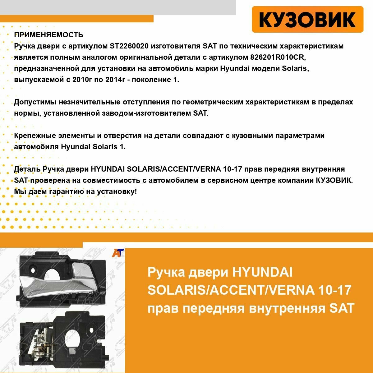 Ручка двери HYUNDAI SOLARIS/ACCENT/VERNA 10-17 правая передняя внутренняя SAT ST-226-0020 интересное: