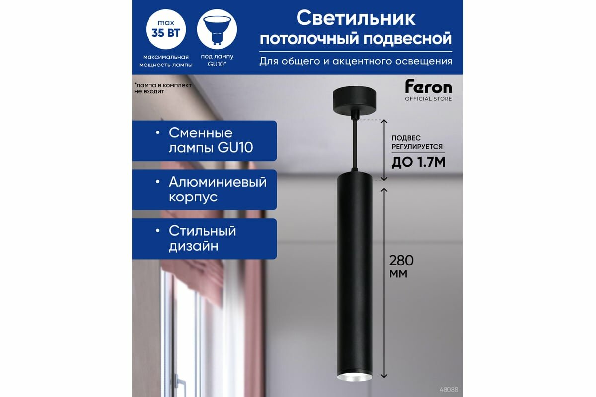 Светильник потолочный ML1768 на подвесе MR16 35W 230V, черный 55*280, FERON 48088 (1 шт.)
