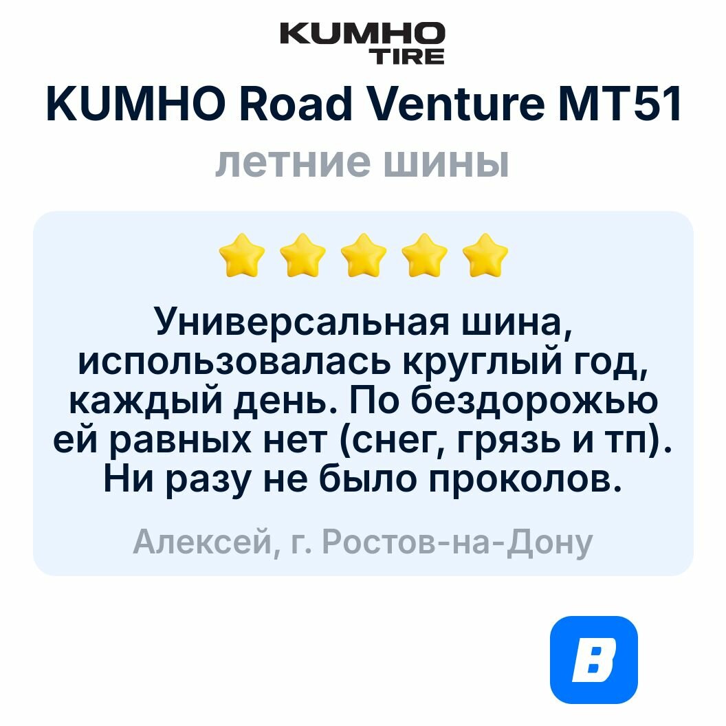 Ниже Вы можете прочитать отзывы на Шины летние Kumho MT-51 235/75 R15 110/107 Q, ознакомится с подробными характеристиками, посмотреть интересные обзоры и фотографии на Шины летние Kumho MT-51 235/75 R15 110/107 Q.