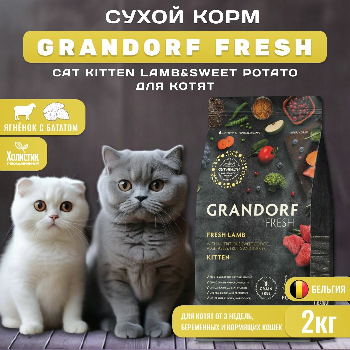 Корм сухой для кошек Grandorf FRESH Cat KITTEN Lamb&Sweet Potato (Свежее мясо ягненка с бататом для котят) 2 кг.