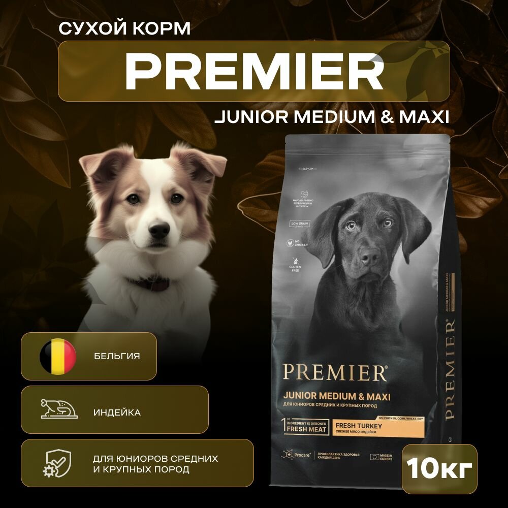 Сухой корм для юниоров средних и крупных пород с 4-х месяцев, беременных и кормящих собак,10 кг Premier Dog Turkey JUNIOR Medium&Maxi, супер-премиум, гипоаллергенный