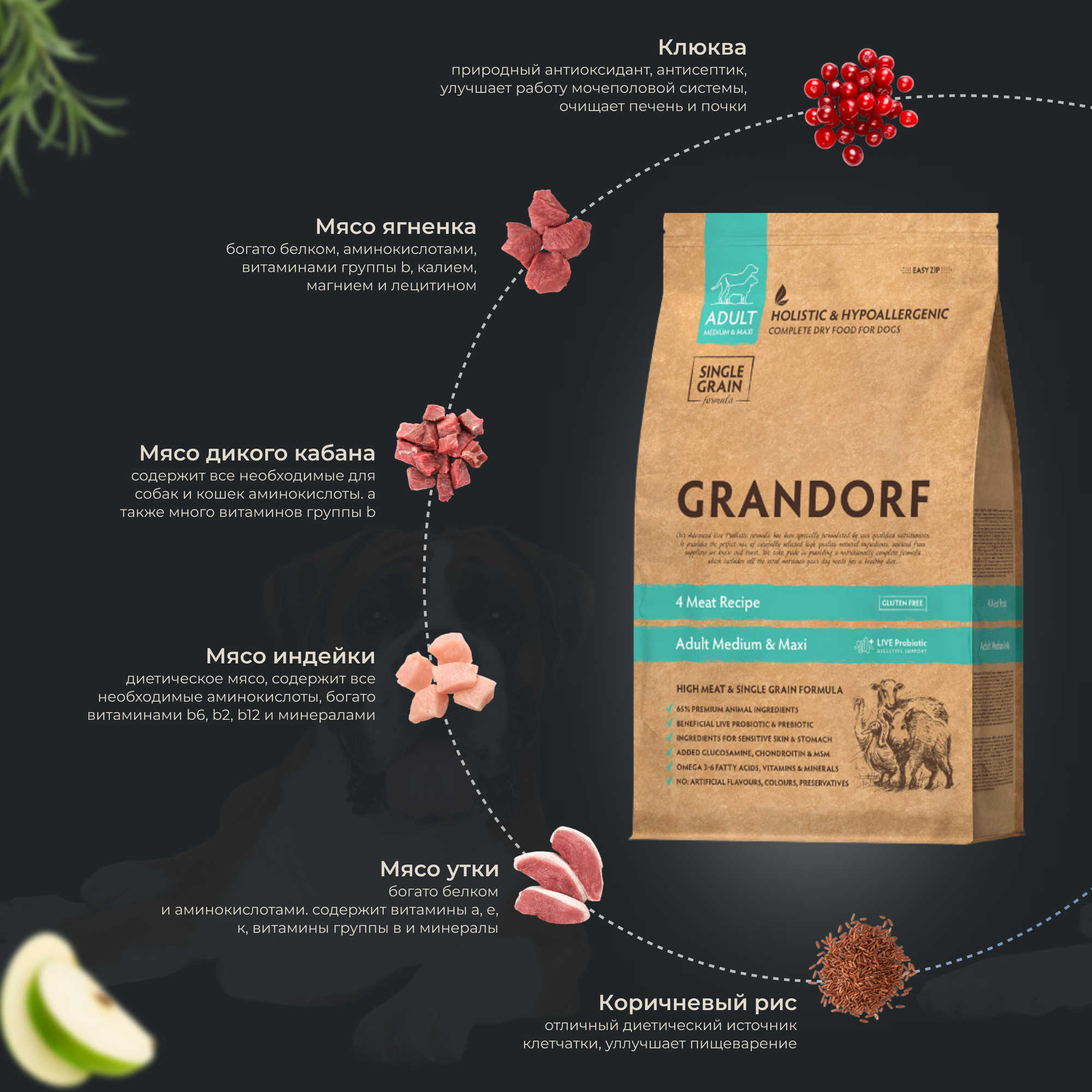 GRANDORF SINGLE GRAIN DOG ADULT MEDIUM & MAXI BREEDS 4 MEAT RECIPE низкозерновой для взрослых собак средних и крупных пород 4 вида мяса с ягненком, индейкой, уткой и кабаном (1 кг)