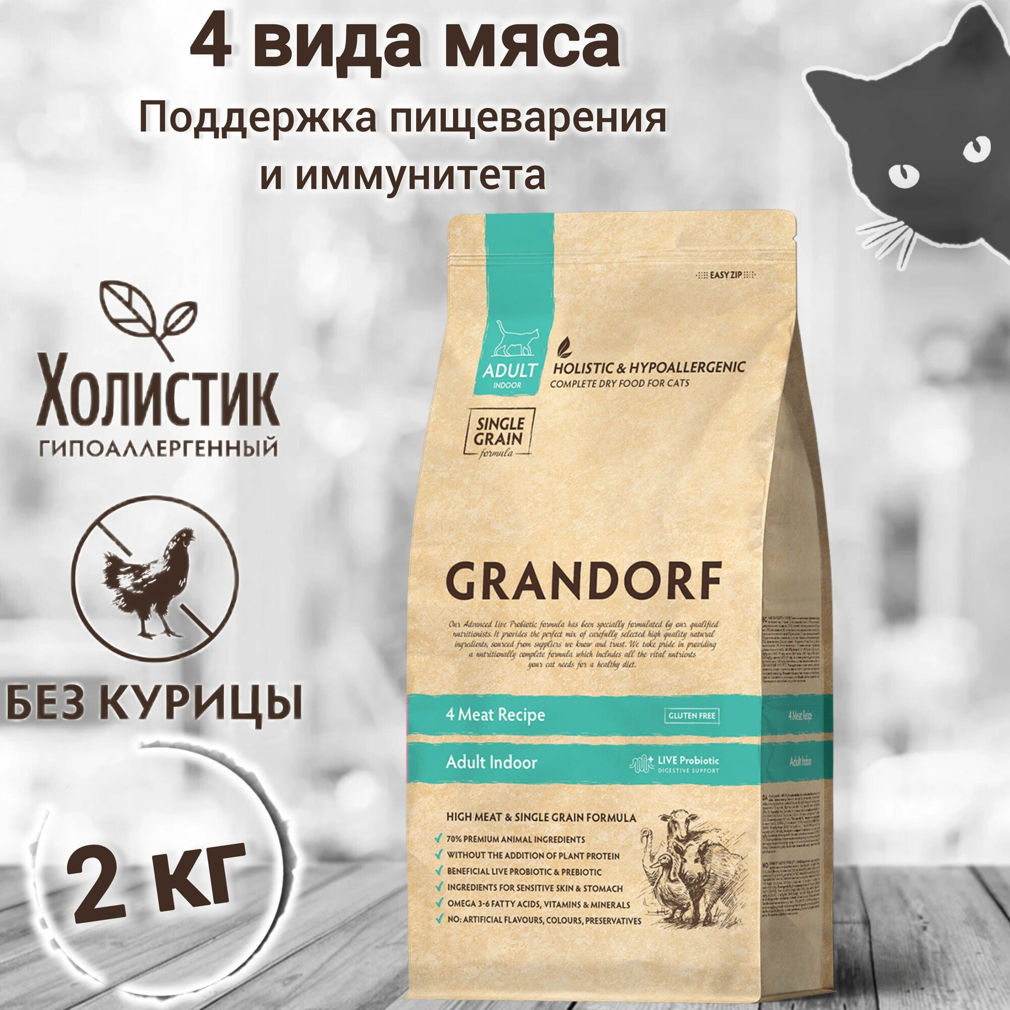 GRANDORF SINGLE GRAIN CAT ADULT INDOOR 4 MEAT RECIPE низкозерновой для взрослых кошек живущих дома 4 вида мяса с индейкой, уткой, кабаном и ягненком (2 + 2 кг)