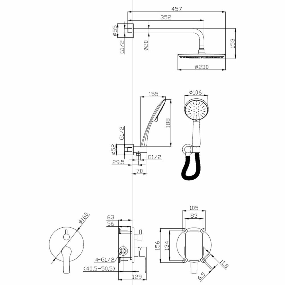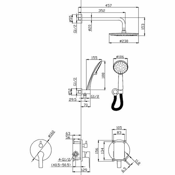 Душевая система Esko Classic встраиваемая с верхним душем d230 мм с лейкой d106 мм со смесителем черная (6in1 SB)