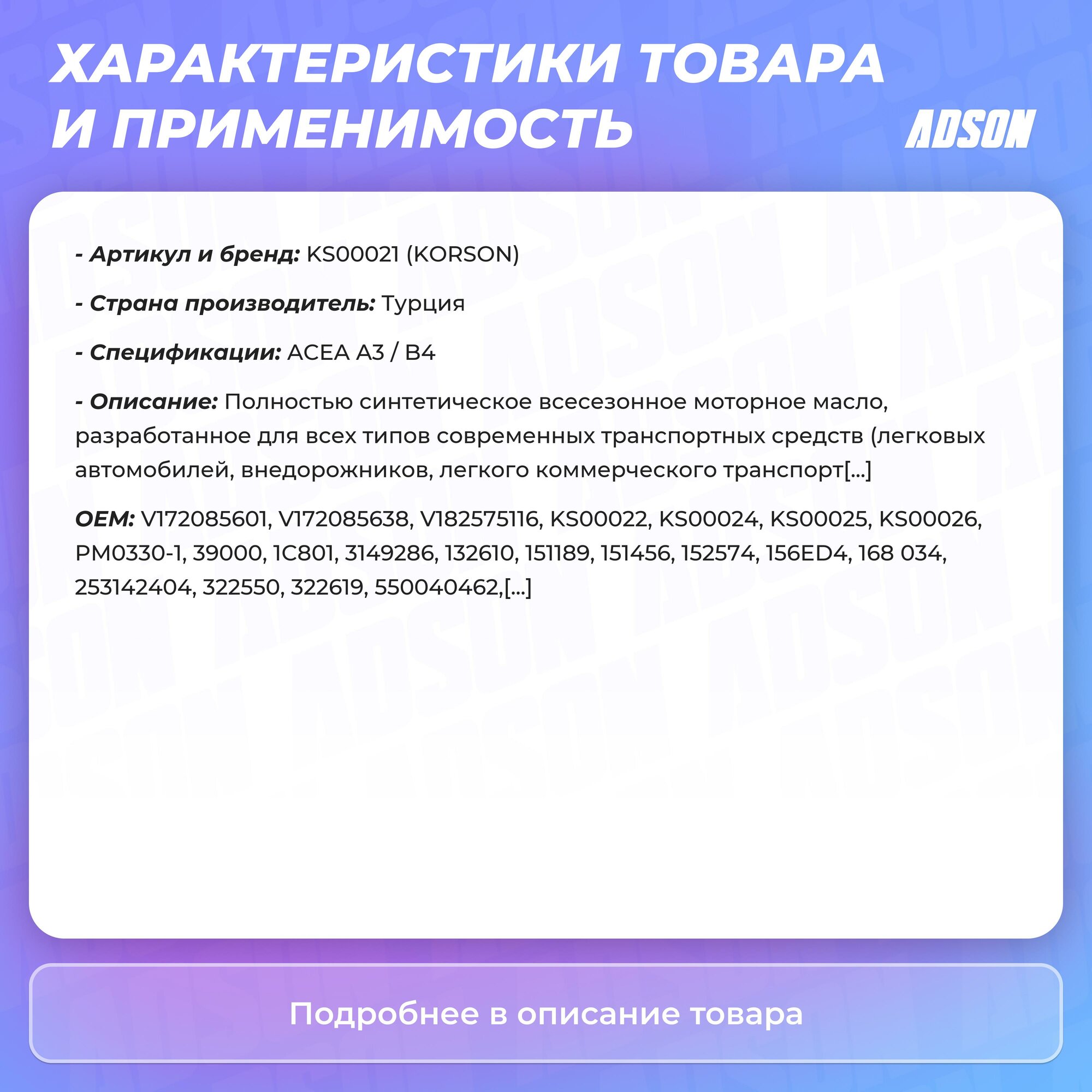 Ниже Вы можете прочитать отзывы на 5W-30 SEMI SYNTHETIC A3 B4 1л (полусинт. мотор. масло) KORSON KS00091, ознакомится с подробными характеристиками, посмотреть интересные обзоры и фотографии на 5W-30 SEMI SYNTHETIC A3 B4 1л (полусинт. мотор. масло) KORSON KS00091.