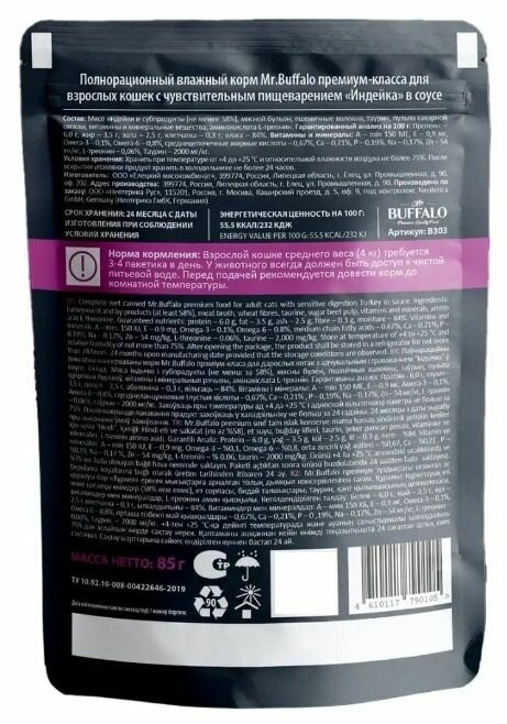 Mr.Buffalo ADULT SENSITIVE пауч влажный корм для кошек с чувствительным пищеварением индейка в соусе, 85 г