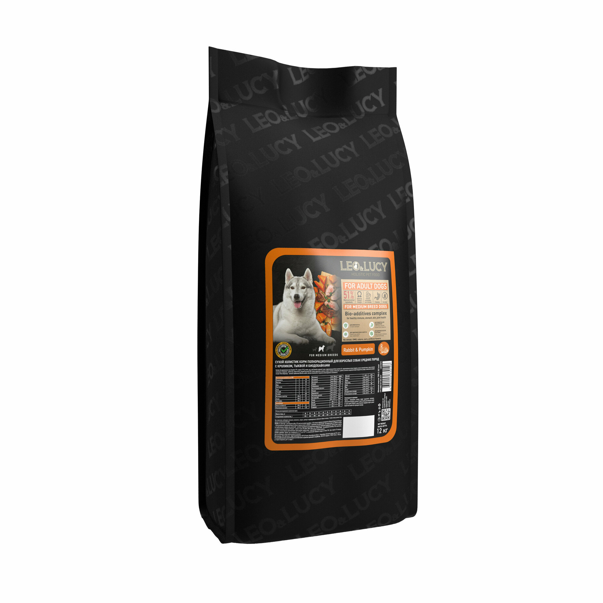 Купить LEO&LUCY сухой холистик корм полнорационный для взрослых собак средних пород с кроликом, тыквой и биодобавками, 12 кг