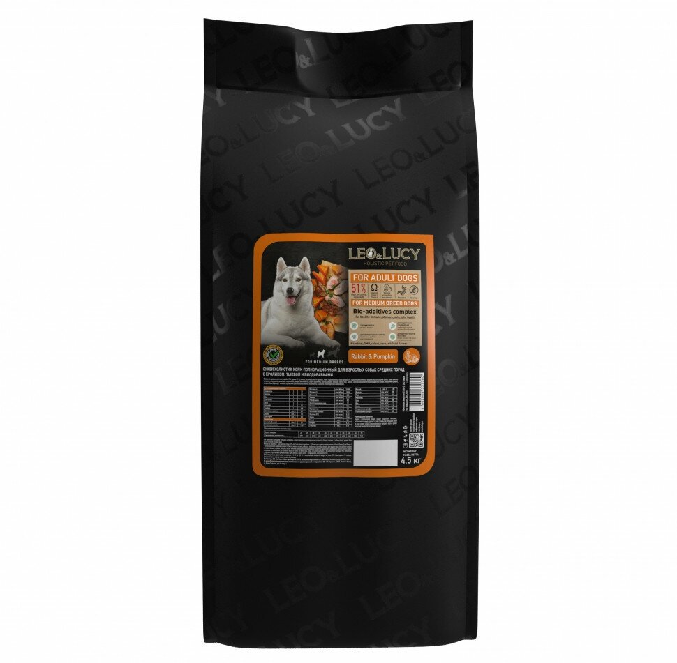 Купить LEO&LUCY сухой холистик корм полнорационный для взрослых собак средних пород с кроликом, тыквой и биодобавками, 4,5 кг