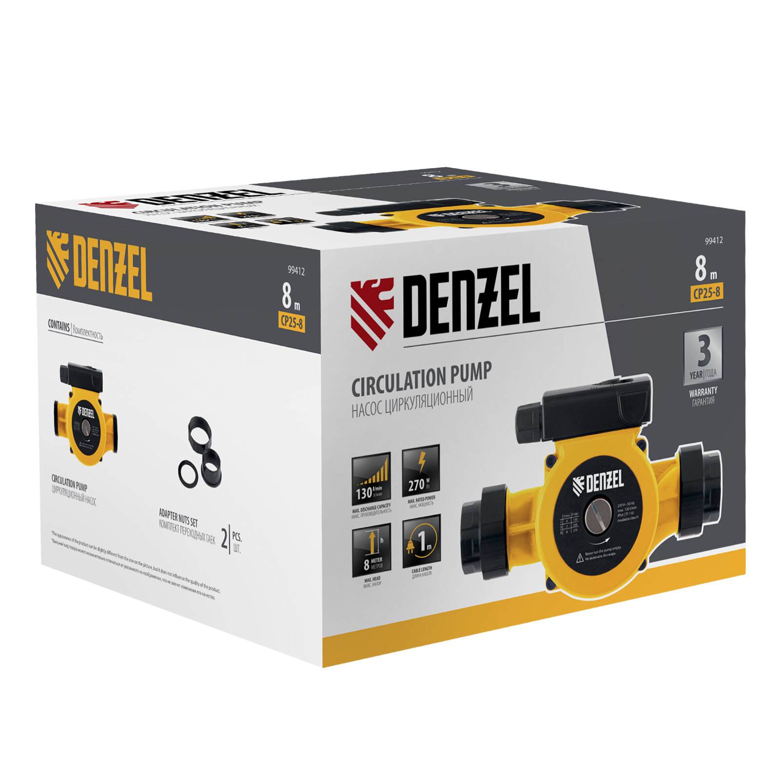 Купить Циркуляционный насос DENZEL CP25-8, напор 8 м, 130 л/мин, 1 м кабель, монт. длина 180 мм