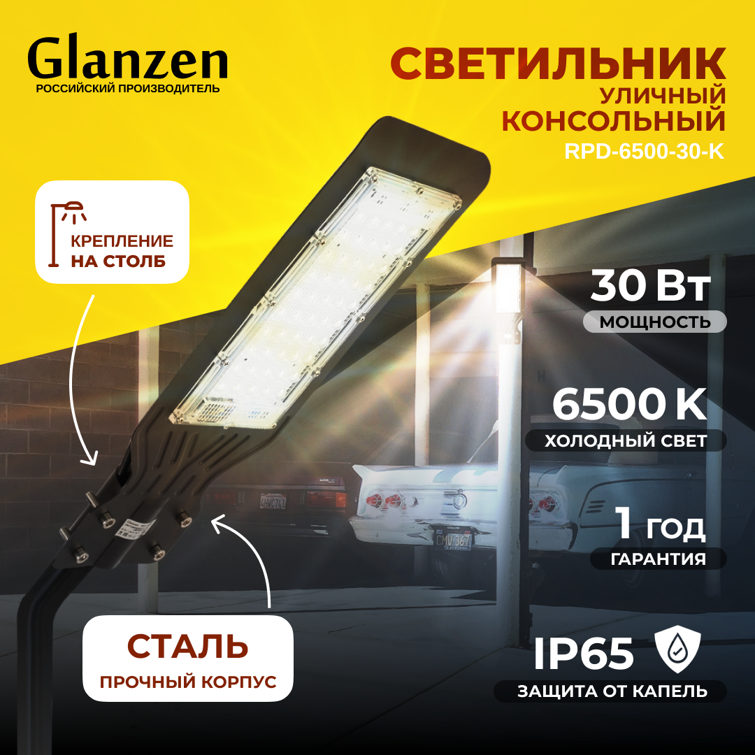 Купить Светодиодный уличный консольный светильник GLANZEN 30W RPD-6500-30-k 6500K IP65