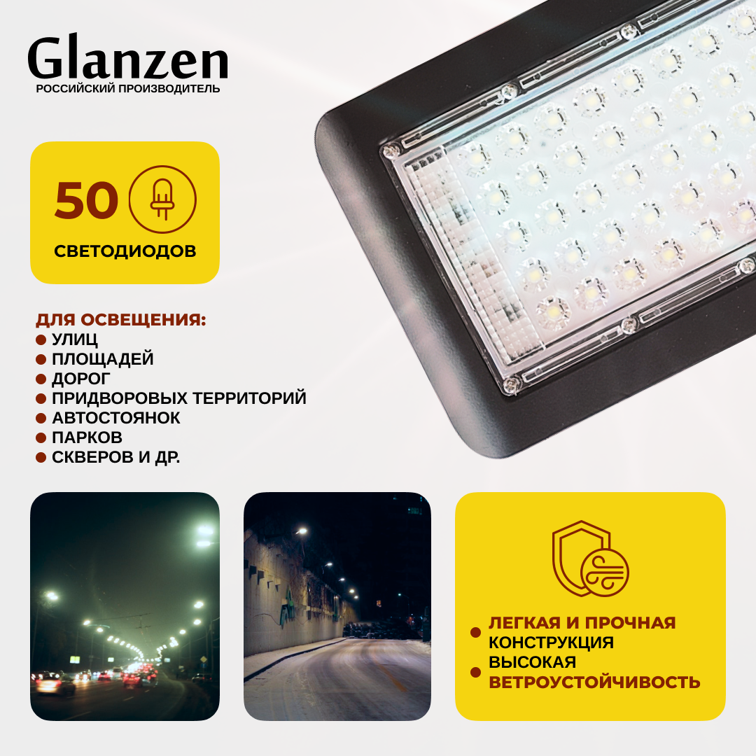 Светодиодный уличный консольный светильник для улицы GLANZEN 50W RPD-6500-50-k 6500K IP65