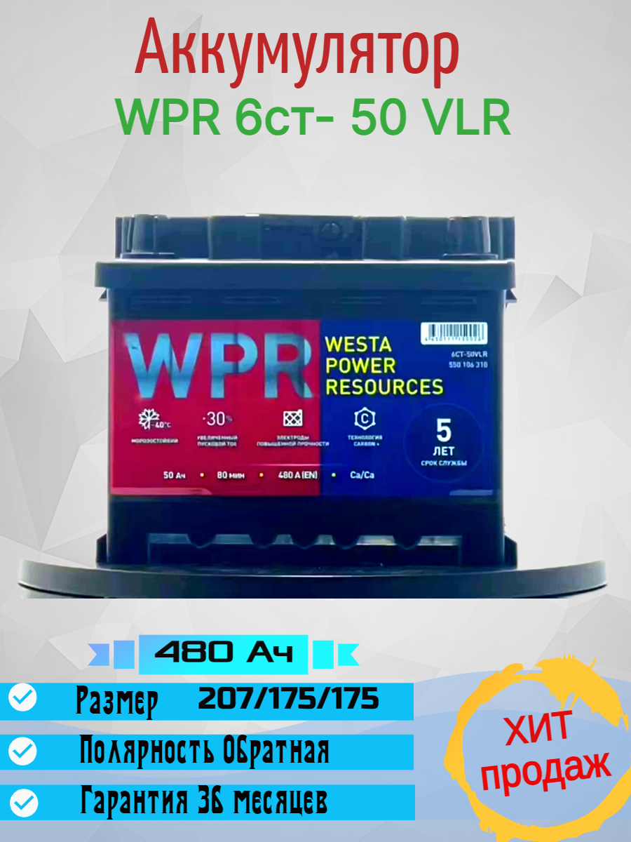 Автомобильный аккумулятор премиум класса WPR 6ст- 50 VL LB прямая полярность