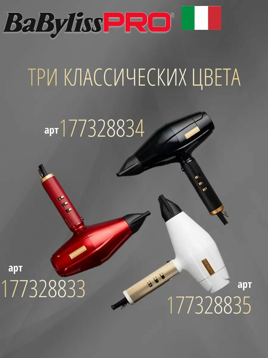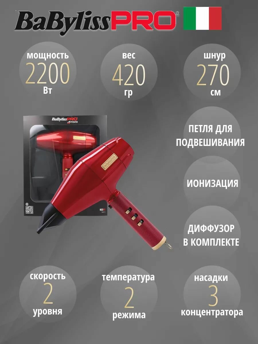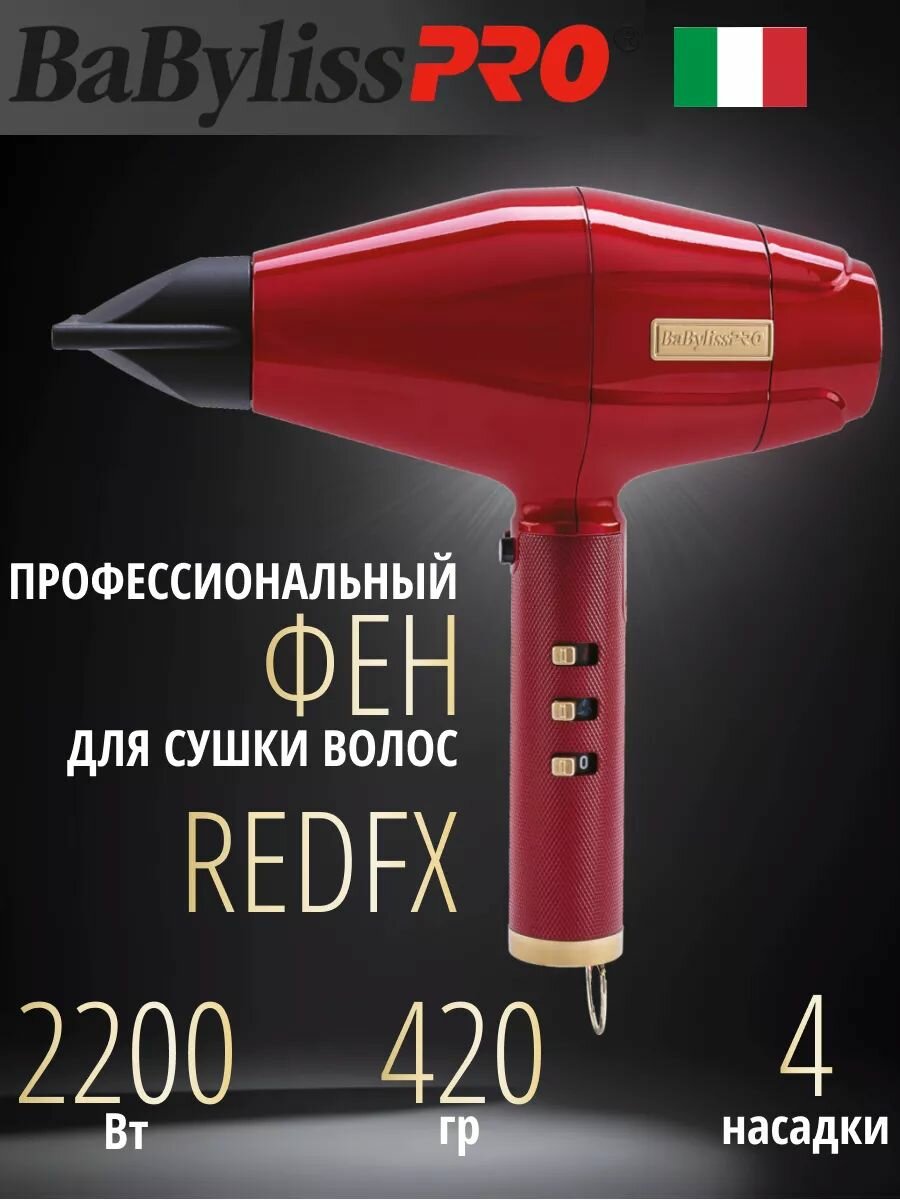 Фен для волос профессиональный с ионизацией Babyliss Pro REDFX 2200W FXBDR1E, концентратор, диффузор, насадка-расческа. Сделано в Италии.