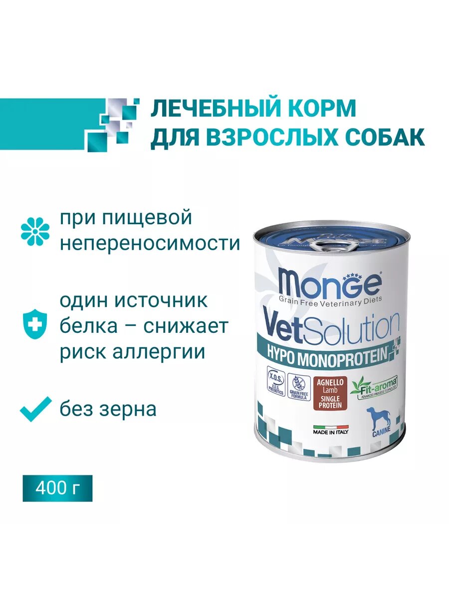 Купить Корм для собак Monge VetSolution Hypo Monoprotein влажный при пищевой непереносимости с ягненком 6 шт по 400 гр