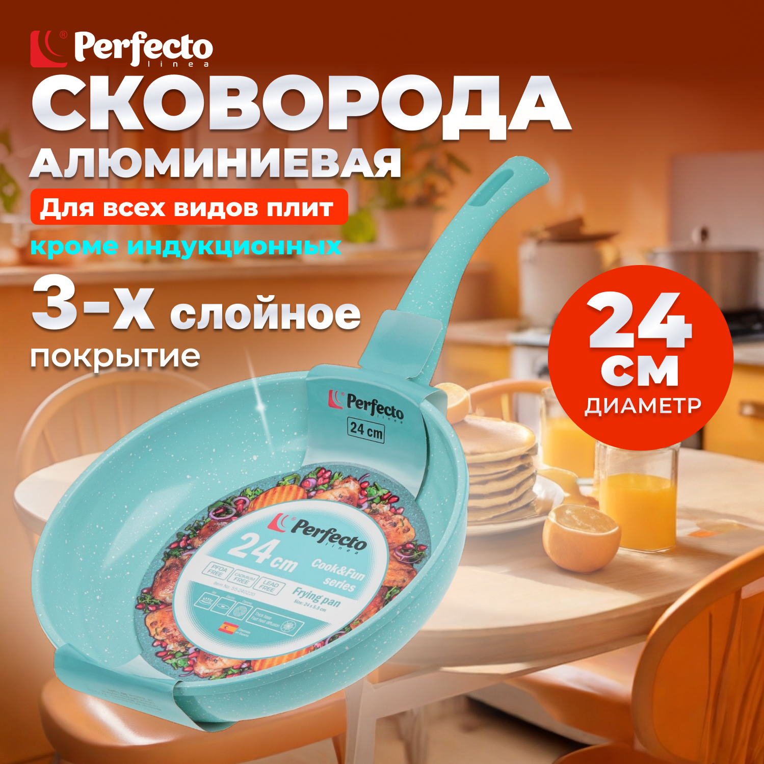 Сковорода алюминиевая PERFECTO LINEA Cook&Fun d24х5,5 см с антипригарным покрытием голубая (55-240220)