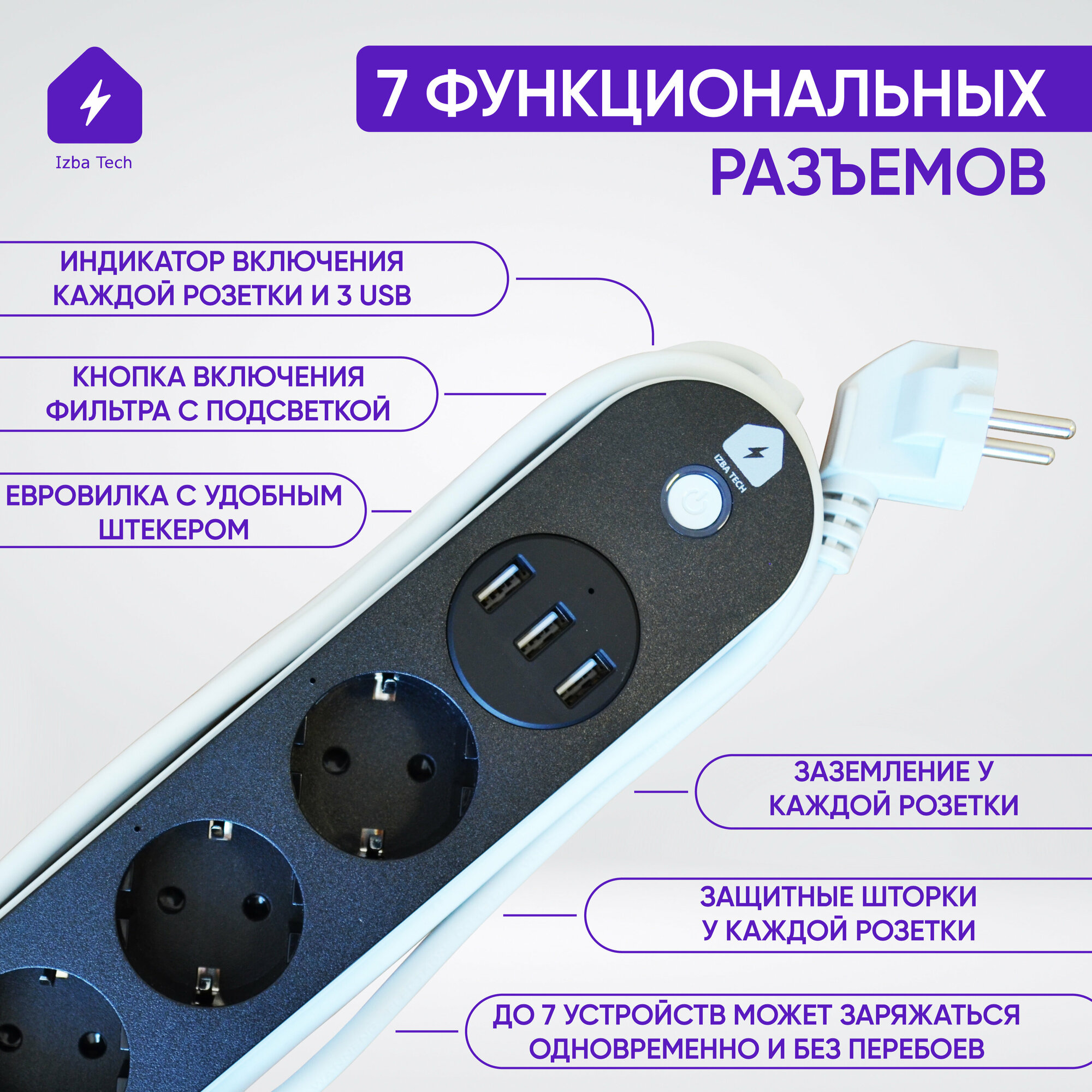 | Особенности | USB порт, выключатель на корпусе, световая индикация, шторки на розетке |
