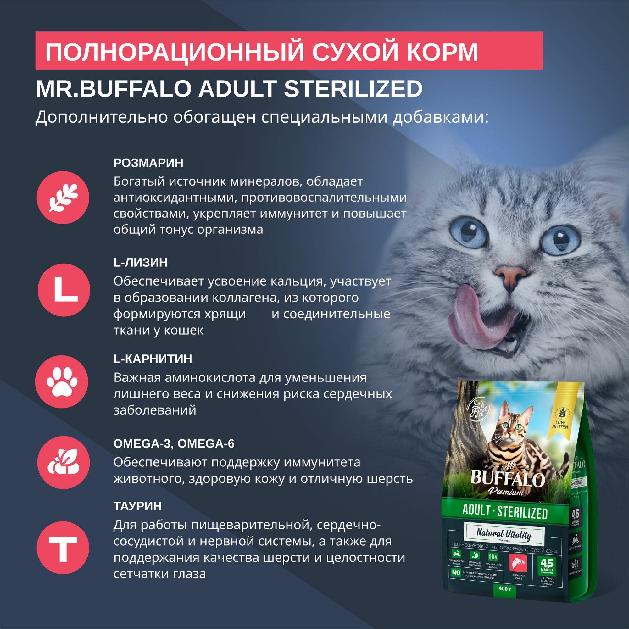 Mr.Buffalo Полнорационный сухой корм для взрослых стерилизованных котов и кошек Adult Sterilized, с лососем, 1,8 кг