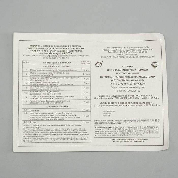 Аптечка автомобильная ФЭСТ футляр из полистирола, новый состав по приказу № 1080Н от 08.10.20