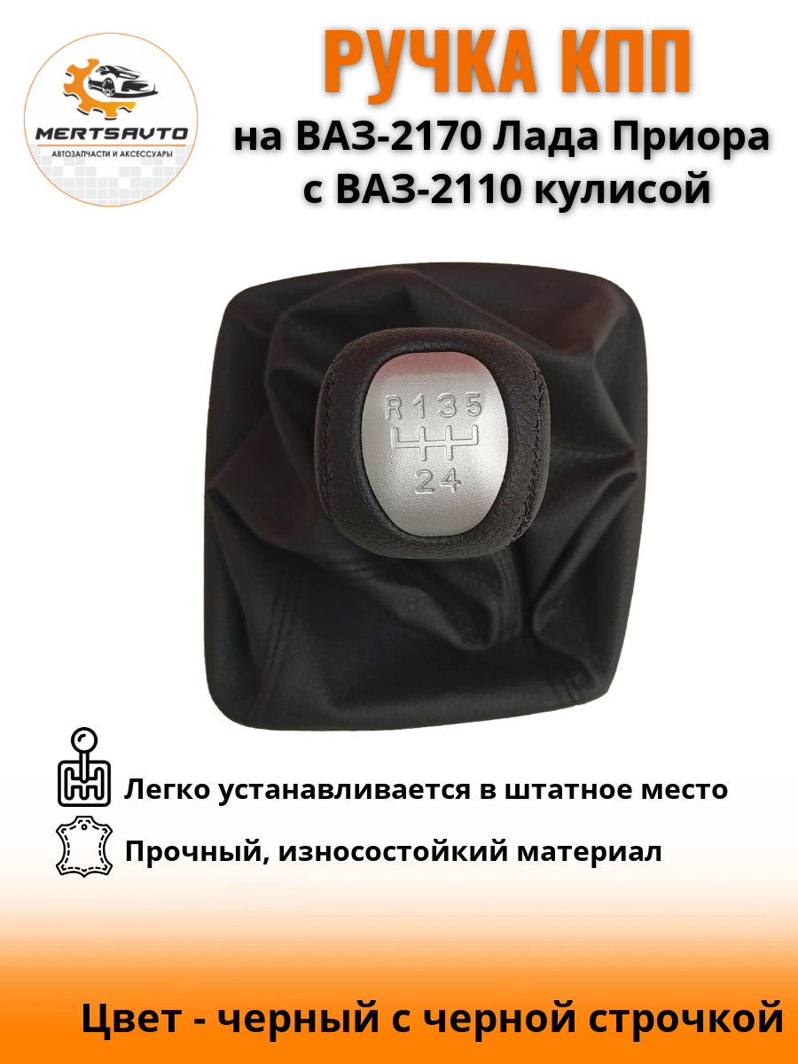Ручка КПП на ВАЗ-2170, Лада Приора 1 (LADA Priora 1) c ВАЗ-2110 кулисой люкс-серебро, ручка коробки переключения передач, черный с черной строчкой