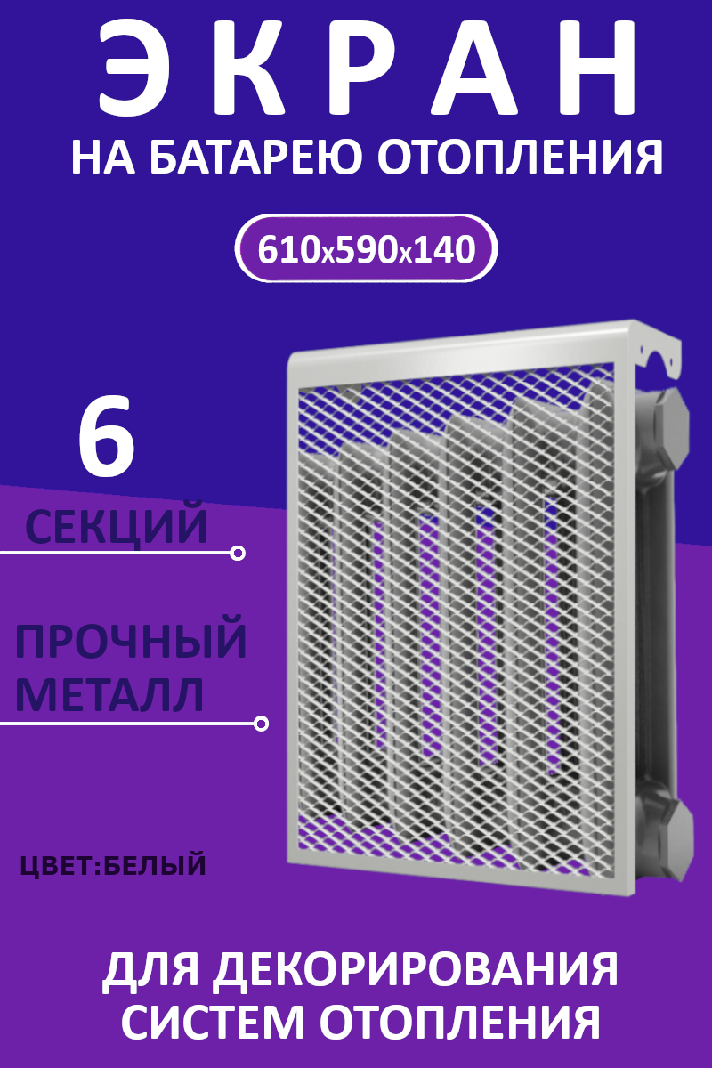 Экран на чугунный радиатор, 590 х 610 х 142 мм, 6 секций, металлический, белый./В упаковке шт: 1