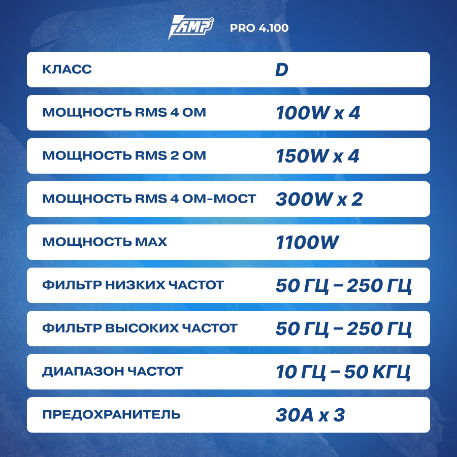 Автомобильный усилитель 4 канала AMP PRO 4.100 интересное: