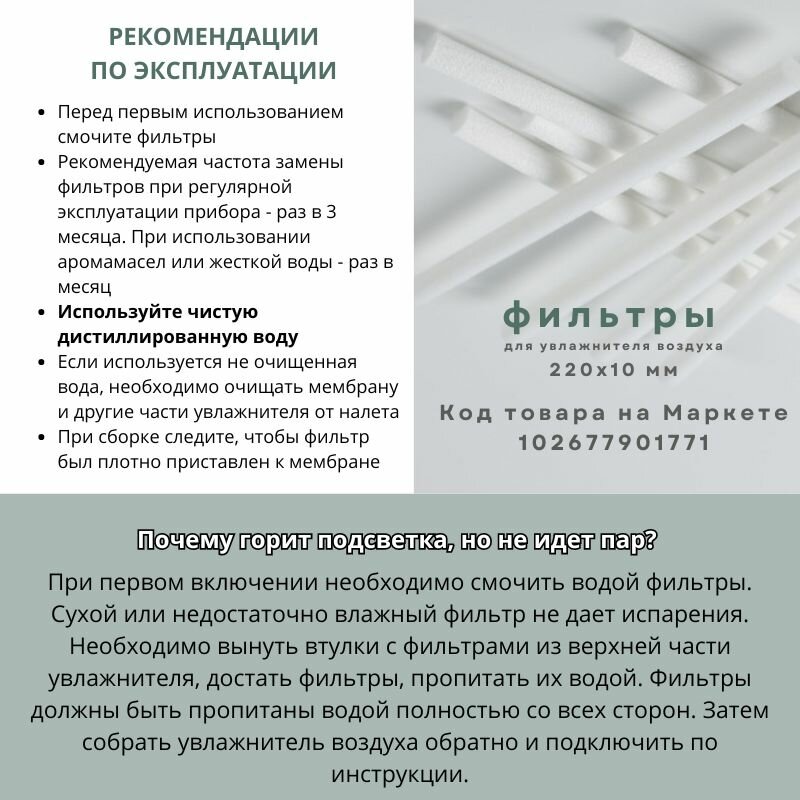 | Подробная комплектация | увлажнитель воздуха, фильтры, эфирное масло, USB кабель, инструкция |