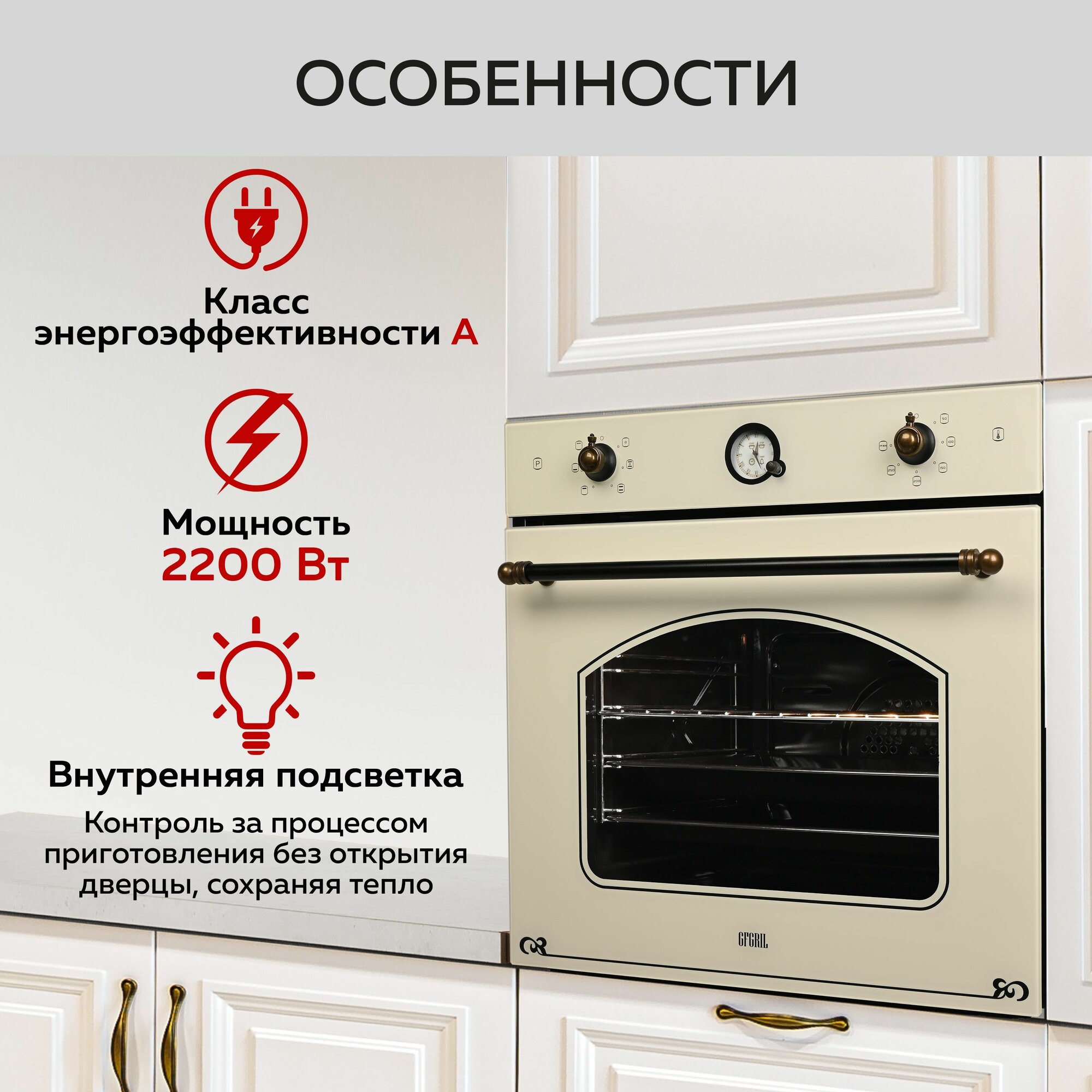 СохранитьGFGRIL Духовой шкаф электрический встраиваемый GF-EO600, стиль Rustic, 67 л, 6 программ, цвет бежевый интересное: