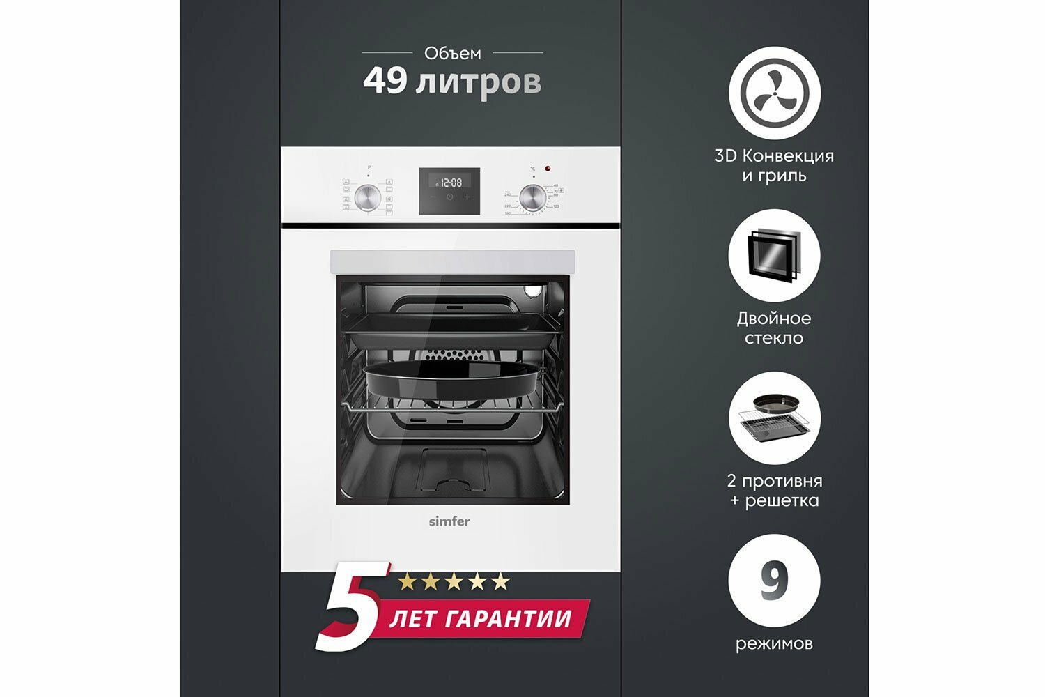 Купить Электрический встраиваемый духовой шкаф Simfer, ширина 45см, 9 режимов, конвекция гриль, таймер + часы, 49 литров, подсветка, 2 противня + хромированная решётка, 5 лет гарантии