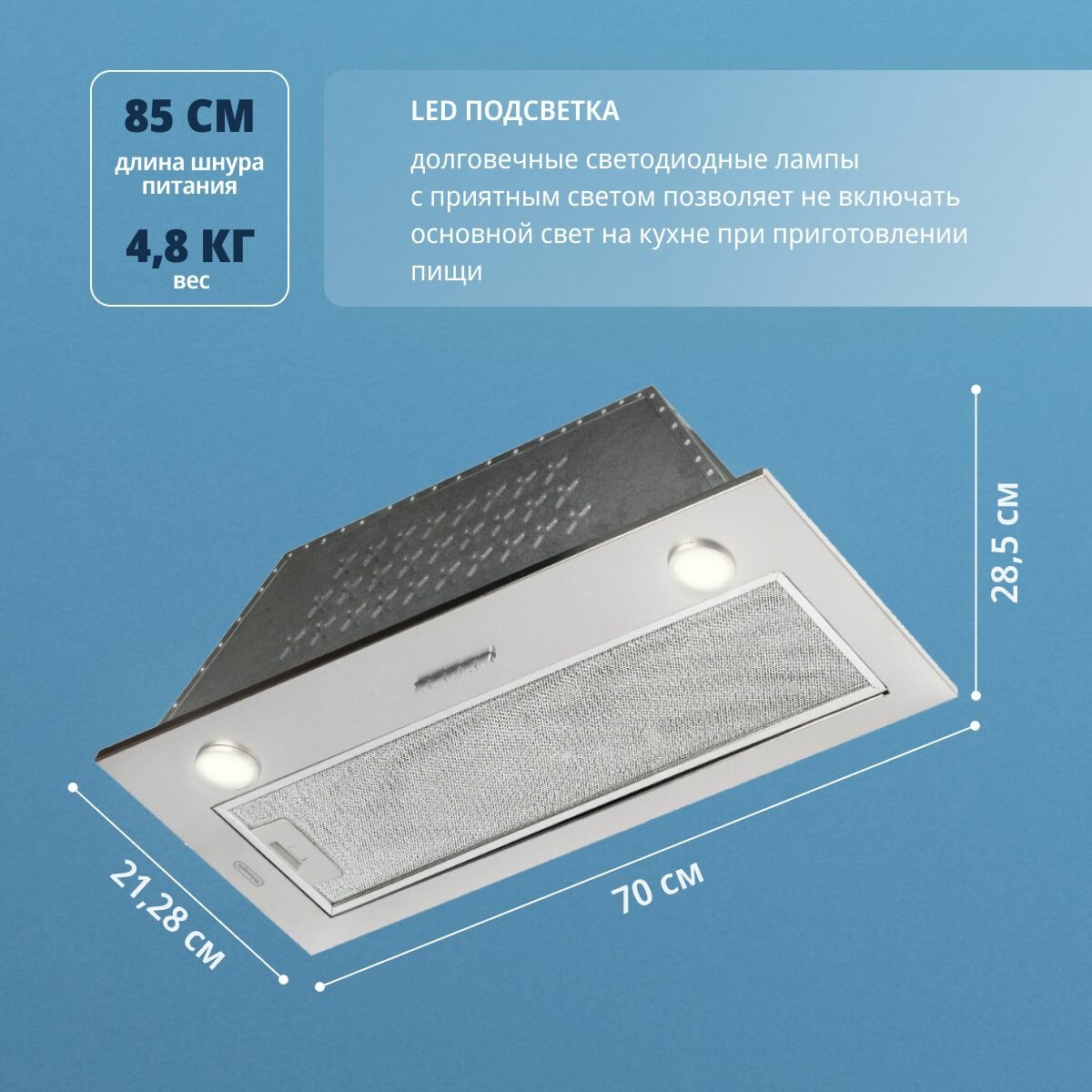 Вытяжка для кухни DeLonghi COSETTA 710 BB, белая, 3 скорости, 1200 м3/ч, сенсорное управление, вытяжка кухонная встраиваемая 70 см