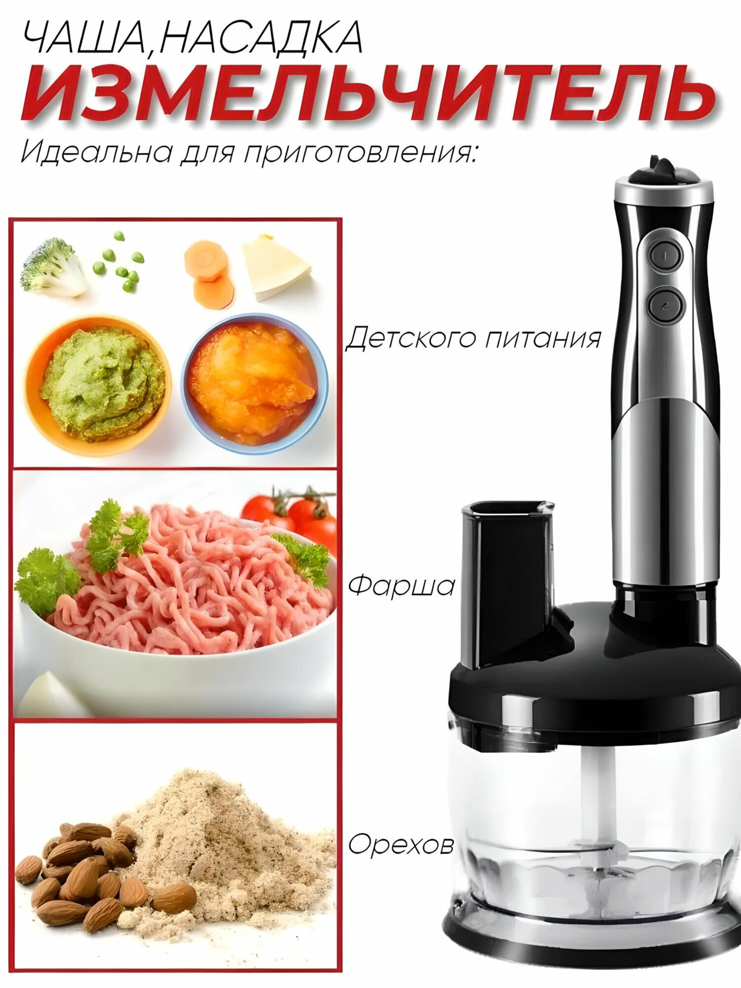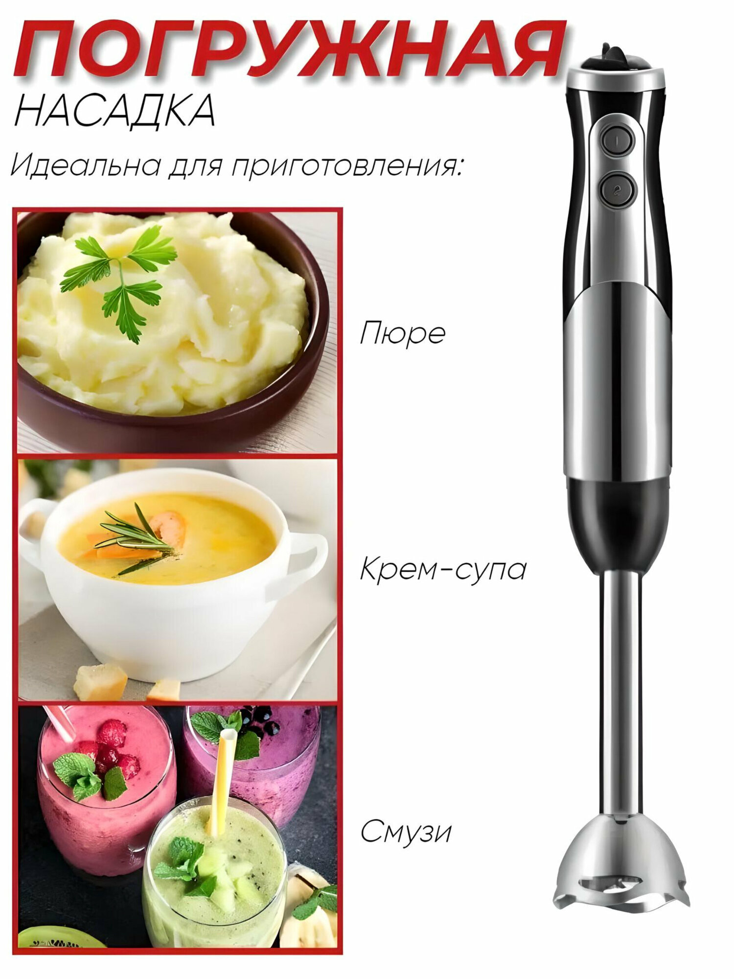 | Насадки | венчик для взбивания / для приготовления пюре / измельчитель / насадка для шинковки / терка |