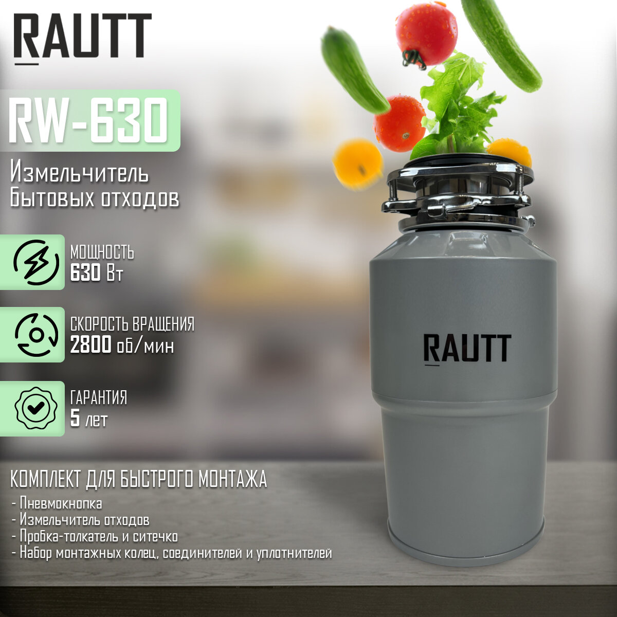 Измельчитель бытовых отходов кухонный RAUTT, RW-800, электрический, встраиваемый измельчитель пищевых отходов