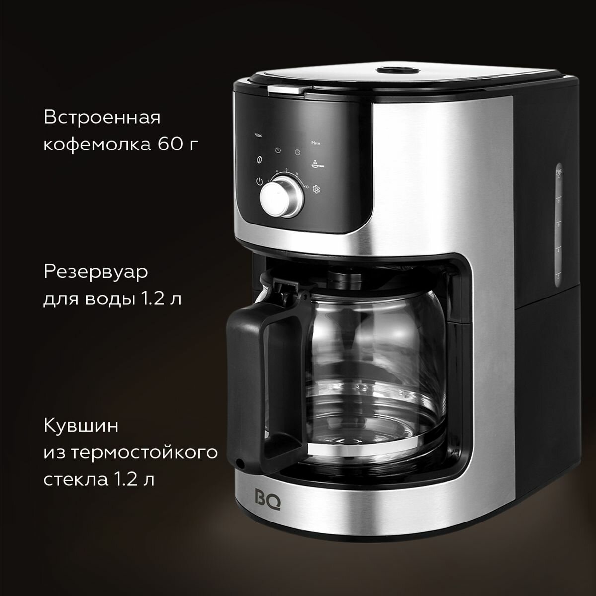 Капельная кофеварка со встроенной кофемолкой BQ CM1010 Черно-серебристая / 1050 Вт / 1.2л